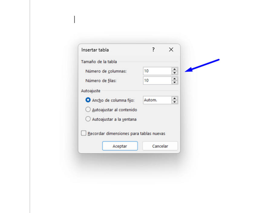 En la ventana emergente que aparece a continuación puedes seleccionar el tamaño que quieres que tenga tu crucigrama. Para este ejemplo vamos a elegir un crucigrama de 10 x 10.