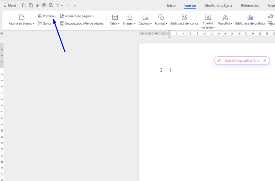 El proceso de creación de una portada elegante y atractiva es similar en WPS Office. Para hacerla dirígete a la pestaña 'Insertar' del menú superior, y pulsa sobre la opción 'Portada' que verás en la parte izquierda de la barra de herramientas.