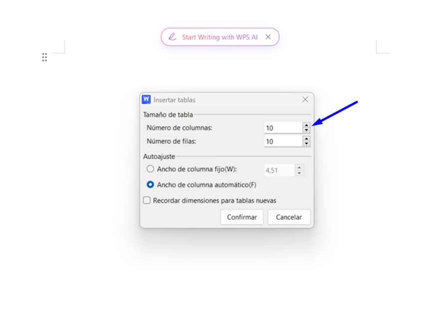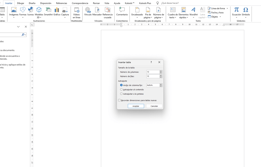 En la ventana emergente que aparece a continuación, indica el número de columnas y filas que quieres que tenga la sopa de letras. Vamos a hacer una de 10 x 10.