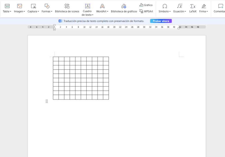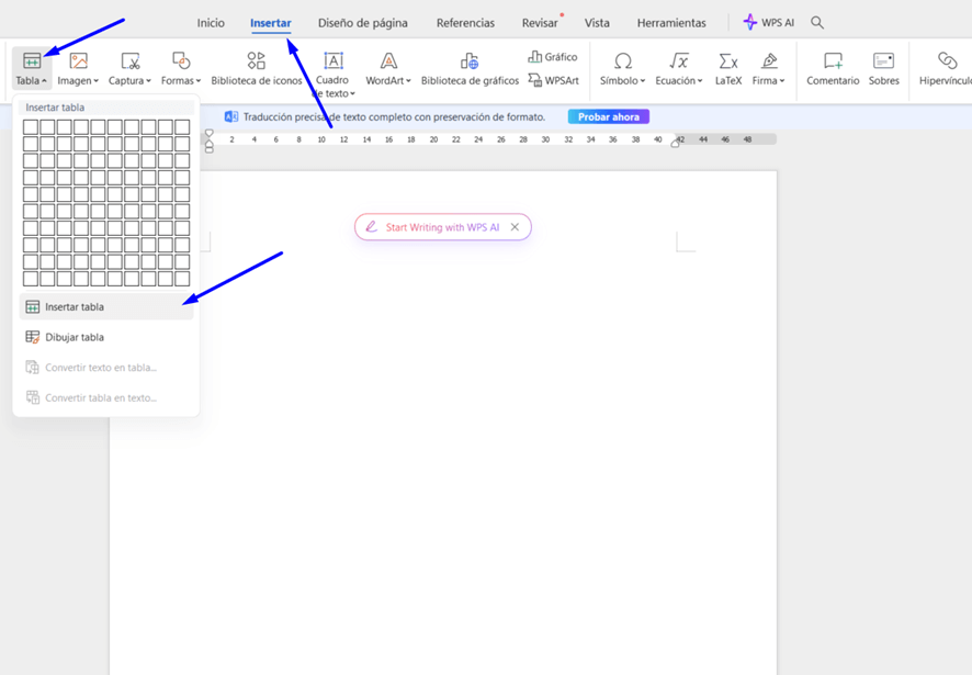 La interfaz de WPS Docs es muy similar a la del Word, así que vas a poder crear una sopa de letras de manera muy sencilla con este software. Para hacerlo, ve a la pestaña 'Insertar', pulsa sobre la opción 'Tabla', y luego pulsa el botón 'Insertar tabla'.