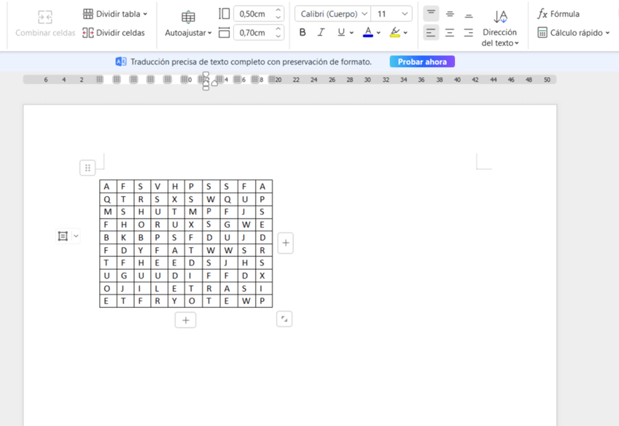 Ahora solo te quedará rellenar el resto de las celdas con letras aleatorias para completar la sopa de letras. ¡Ha quedado genial!