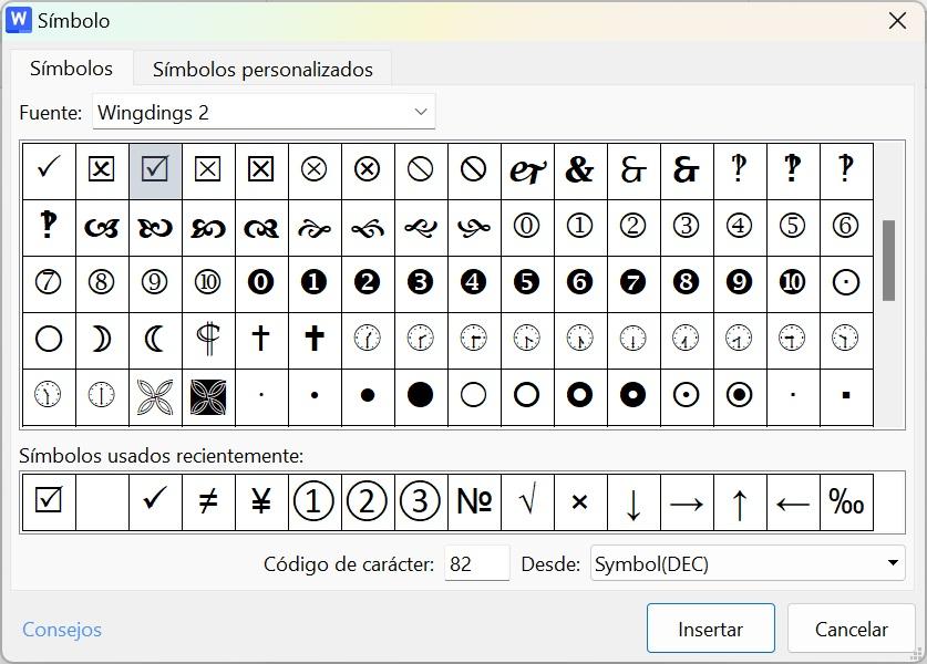 Insertar la casilla de verificación en un documento de Word con símbolos.