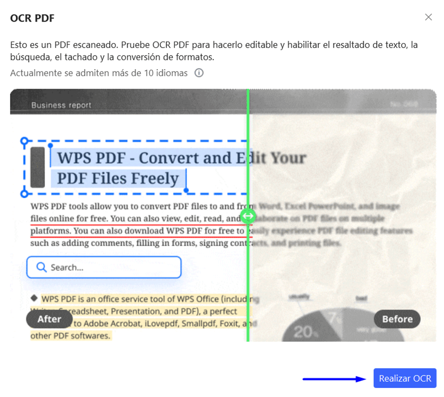 Encontrar una palabra en un documento PDF puede agilizarnos mucho el trabajo, pero no todos los PDF están preparados para esto. Con WPS Office puedes digitalizar cualquier documento PDF mediante OCR, y entonces podrás usar la función de búsqueda mediante el comando CTRL + F. Se trata de una manera eficaz y segura de encontrar palabras en un documento PDF directamente desde tu dispositivo.