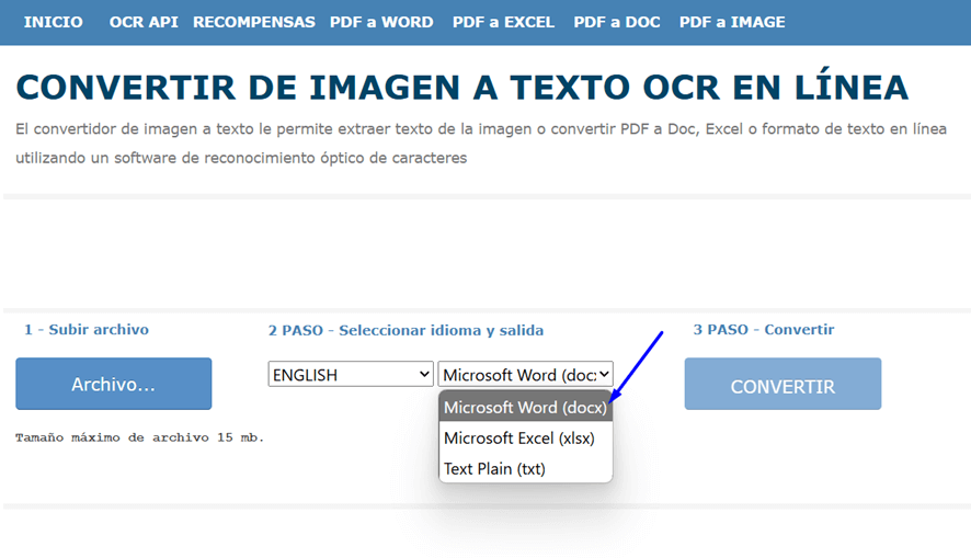 3. Elige entonces el formato de salida del documento. Esta herramienta no permite conservar el archivo en PDF, así que deberás optar por Word, Excel o texto plano.