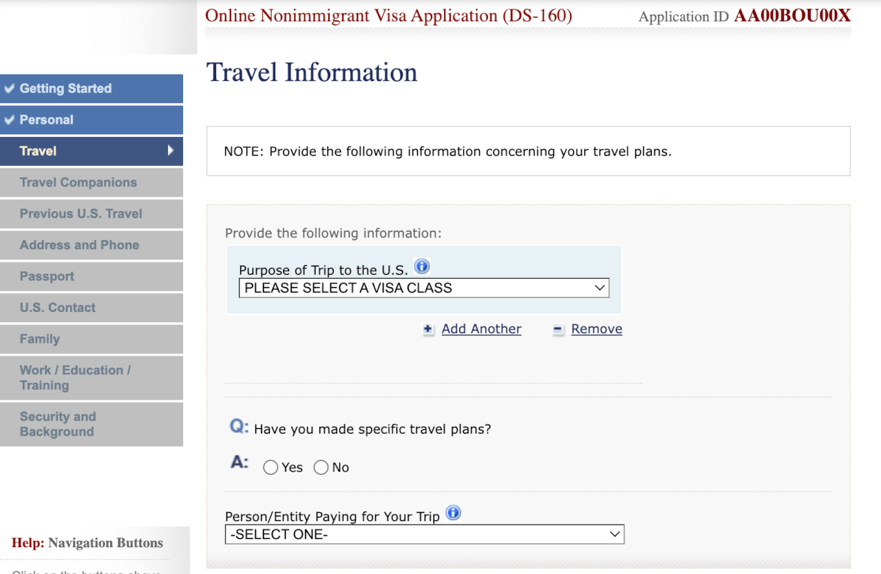 En esta parte del formulario DS-160 en PDF se le solicitará la información sobre los preparativos concretos de su viaje, como el motivo del mismo, las fechas de llegada y salida y el lugar de su estancia en los Estados Unidos.