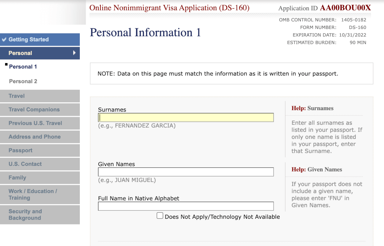 Rellenar el formulario DS-160 en PDF puede llevar alrededor de una hora y media. Está permitido solicitar ayuda a una persona competente y cualificada, como un experto en inmigración. Sin embargo, usted es responsable de firmar electrónicamente y presentar el formulario de solicitud por su cuenta. En esta parte, le guiaremos paso a paso para rellenar el formulario y todas sus secciones