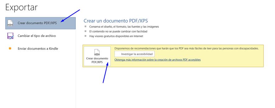 Selecciona entonces la opción ‘Crear documento PDF/XPS’ a la izquierda y, seguidamente, confirma la exportación pulsando el cuadro ‘Crear documento PDF/XPS’ a la derecha.