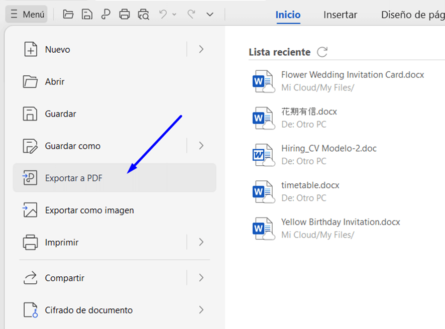 La exportación a PDF en WPS Office funciona de manera análoga a la que puedes encontrar en Microsoft Word, pero más ágil. Por ejemplo, si estás editando un documento de Word en WPS Writer, solo necesitas pulsar el botón ‘Menú’ y, seguidamente, la opción ‘Exportar a PDF’.