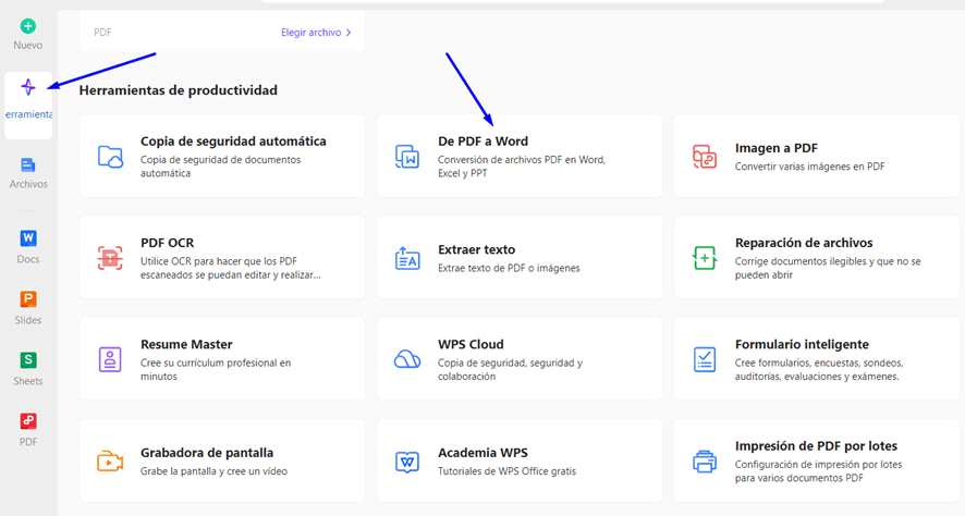 Además, con WPS Office también tienes la posibilidad de convertir documentos PDF a otros formatos con un alto grado de eficacia. Simplemente pulsa en el menú de ‘Herramientas’ y seguidamente elige la opción ‘De PDF a Word’.