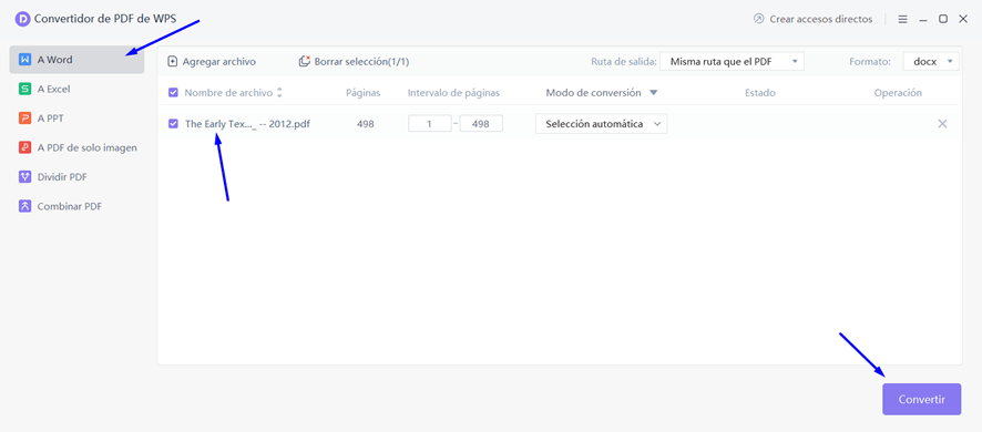 Carga entonces el documento PDF que quieras convertir, y elige seguidamente el formato de destino en la columna de la izquierda. Puedes convertir dos documentos PDF a Word, Excel, PowerPoint o imagen, según lo necesites. Confirma entonces el archivo que quieres convertir, y pulsa el botón ‘Convertir’ de la parte inferior derecha de la pantalla.
