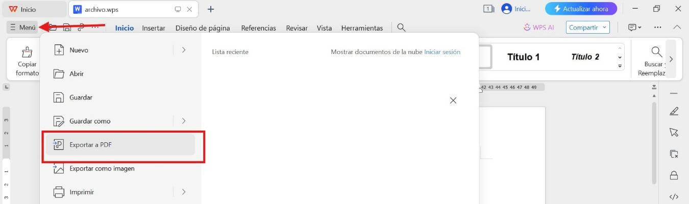 También puede ir a la opción de exportar a PDF haciendo clic en la barra de menú. Y simplemente haga clic en exportar a PDF. Su archivo WPS se convertirá en un PDF directamente.