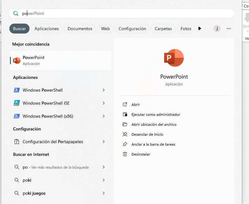 Paso 7: Una vez completada la descarga, simplemente vaya al menú Inicio y busque "PowerPoint". La aplicación Microsoft PowerPoint aparecerá en los resultados de búsqueda. Haga clic en él para empezar a crear sus presentaciones.