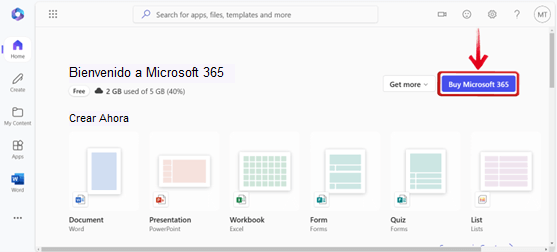 Paso 3: Haga clic en el botón "Comprar Microsoft 365" para revisar las opciones de suscripción disponibles y continuar con la compra de su plan preferido.