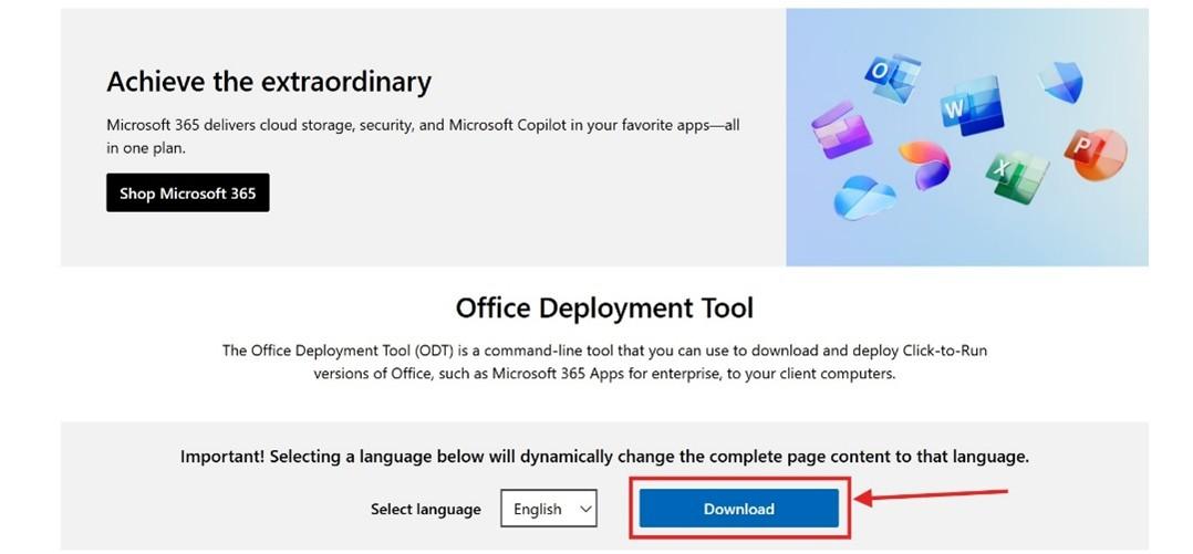 Paso 3: En la página de la Herramienta de Implementación de Microsoft Office, seleccione su idioma preferido y, a continuación, haga clic en “Descargar” para iniciar el proceso.