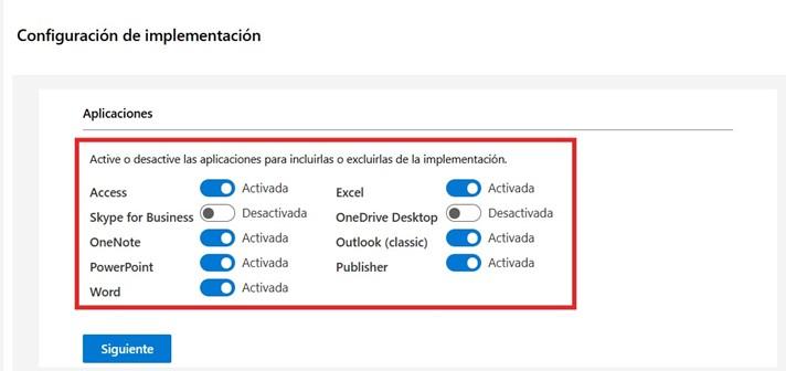 Opciones de selección de aplicaciones en la configuración de la implementación de Office