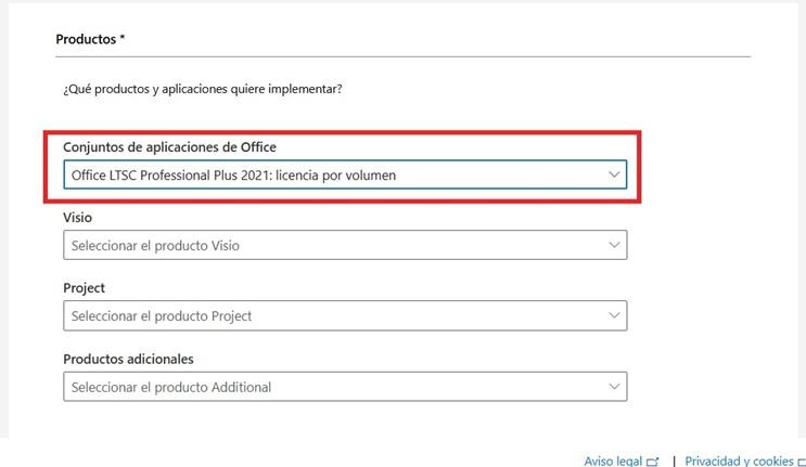 Paso 5: En el campo Suites de Office, seleccione Office LTSC Professional Plus 2021 - Licencia por volumen. Si necesita algún producto adicional, como Visio, puede incluirlo aquí.