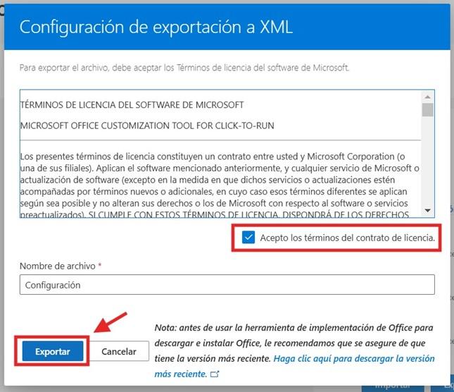 Paso 20: Una vez finalizados todos los ajustes, haga clic en “Exportar” para generar el archivo de configuración. Guarde el archivo como configuration.xml en una carpeta de su elección.