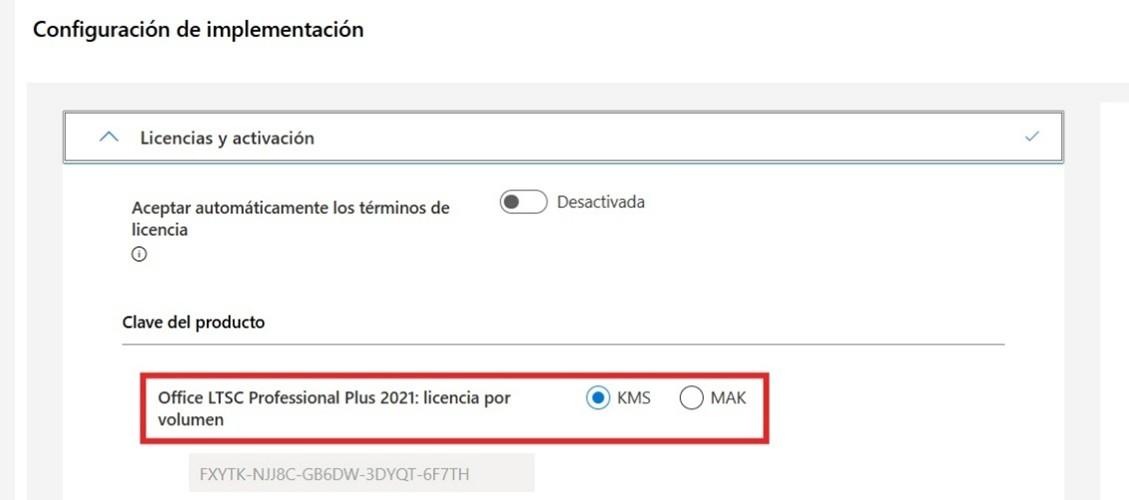Paso 15: Vaya a la sección Licencias y activación. En el campo Clave de producto, seleccione “KMS”, ya que esta implementación no requiere una clave de producto.
