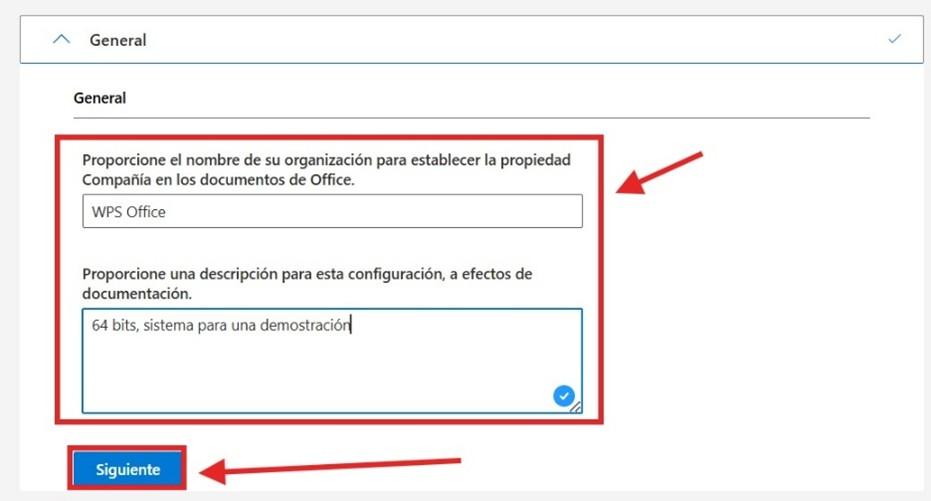 Paso 17: En la sección General, introduzca el nombre de su organización o su nombre personal. Si lo desea, añada una descripción de la implementación.