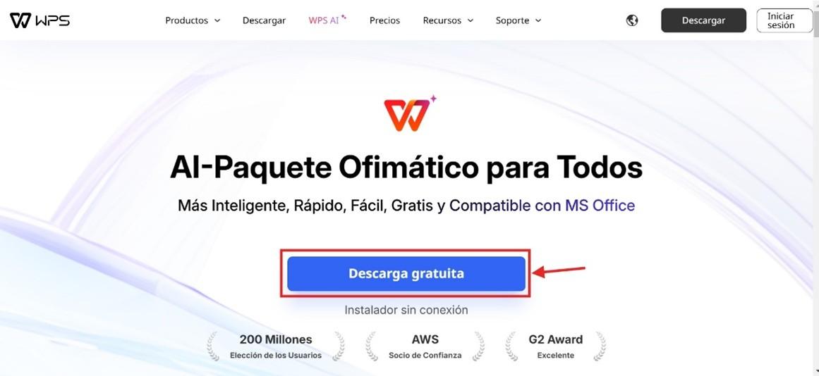 Paso 1: Visite el sitio web de WPS Office a través de su navegador y haga clic en el botón “Descargar” situado en el centro de la página.